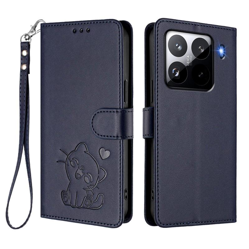 For Xiaomi 15 Pro Embossed Heart Cat Leather Phone Case with Hand Strap(Blue)