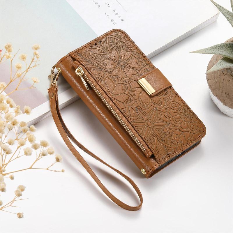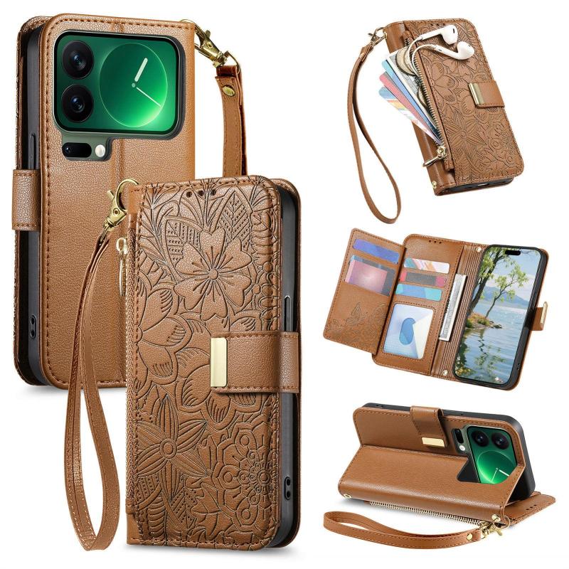 For Xiaomi 17 Pro Flowers Leaves Zipper Wallet Leather Phone Case with Strap(Brown)