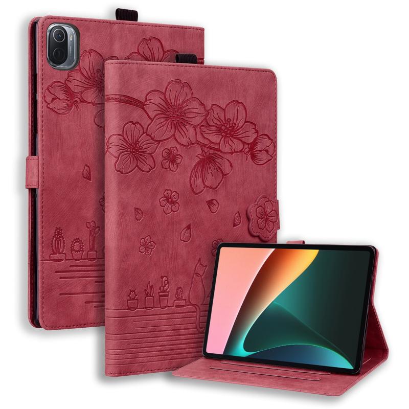 For Xiaomi Pad 5 / 5 Pro Cartoon Sakura Cat Embossed Leather Tablet Case(Red)