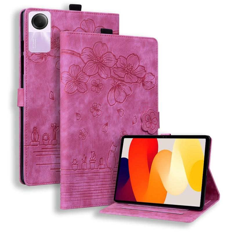 For Xiaomi Redmi Pad SE Cartoon Sakura Cat Embossed Leather Tablet Case(Rose Red)