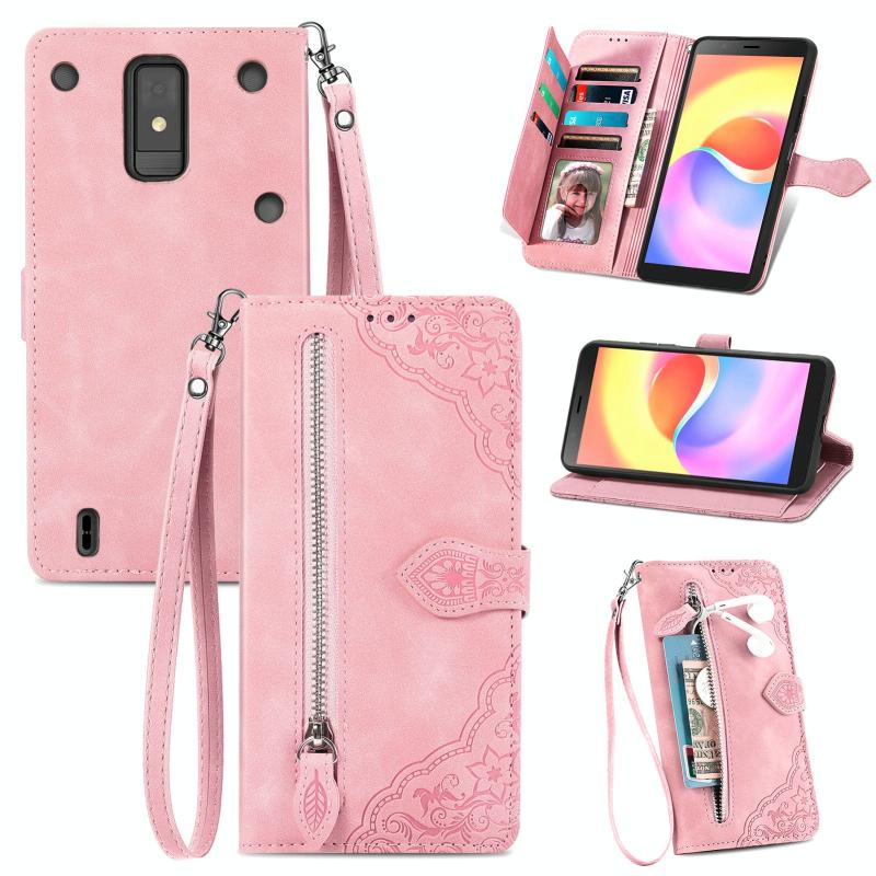 For ZTE Blade A32 Embossed Flower Zipper Leather Phone Case(Pink)