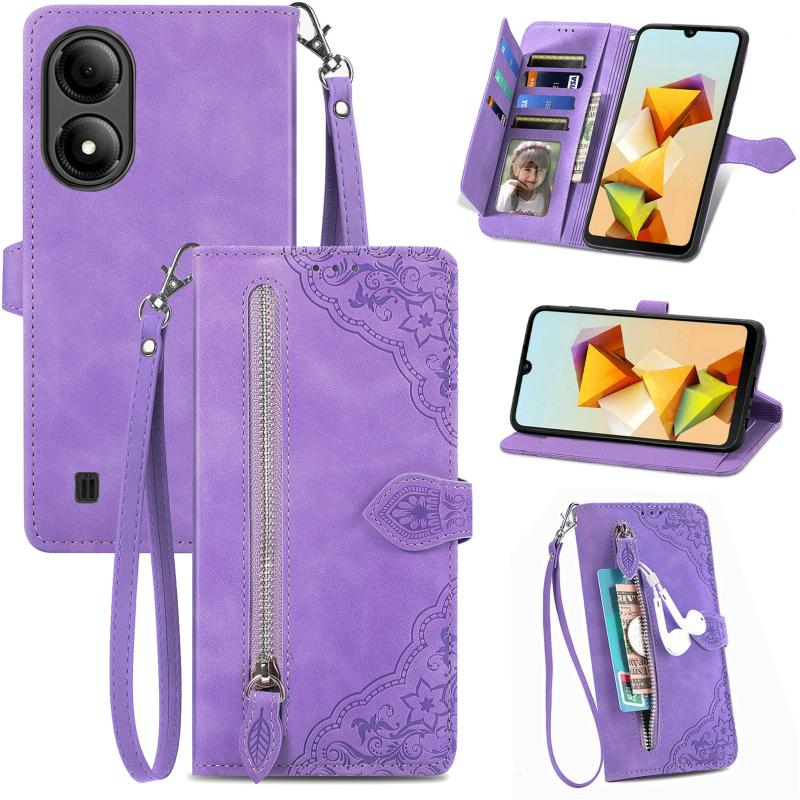 For ZTE Blade A33S Embossed Flower Zipper Leather Phone Case(Purple)