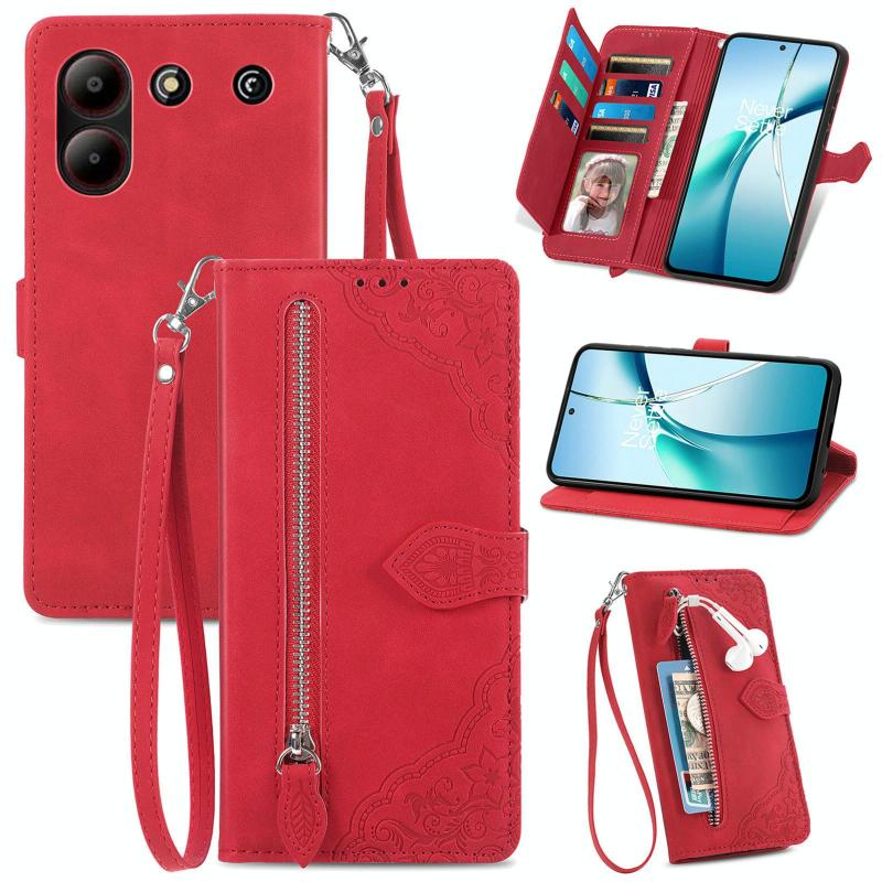 For ZTE Blade A54 Embossed Flower Zipper Leather Phone Case(Red)