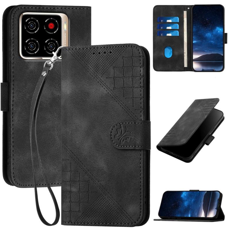 For ZTE Blade A56 4G Grid Butterfly Embossed Pattern Leather Phone Case with Lanyard(Black)