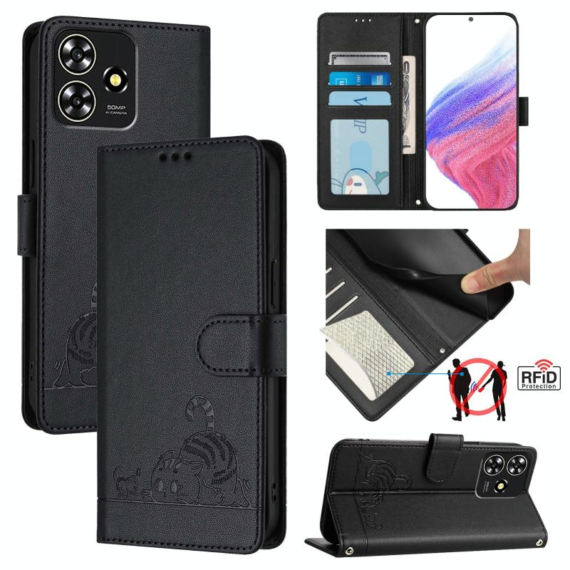 For ZTE Blade A73 4G Cat Rat Embossed Pattern RFID Leather Phone Case with Lanyard(Black)