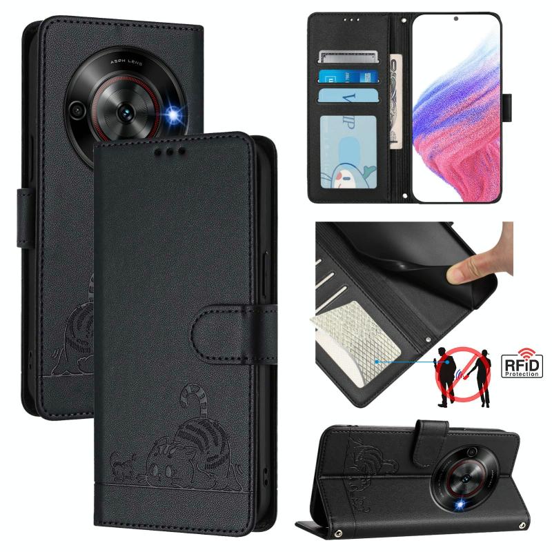 For ZTE Blade A75 5G Cat Rat Embossed Pattern RFID Leather Phone Case with Lanyard(Black)