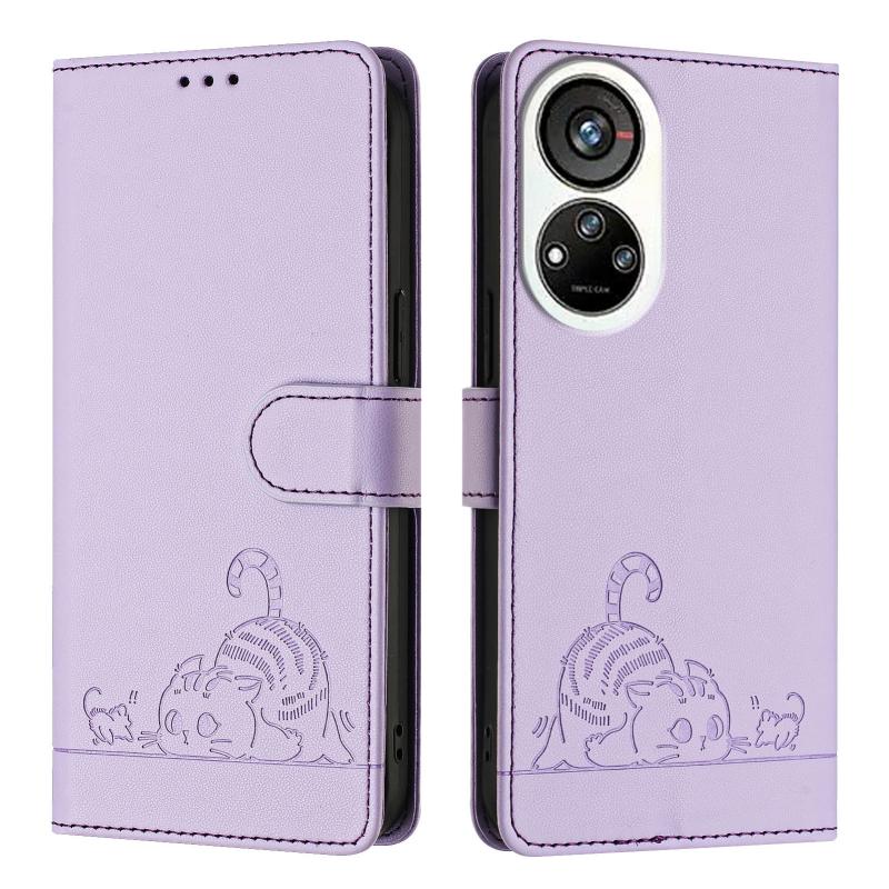 For ZTE Blade V40s Cat Rat Embossed Pattern RFID Leather Phone Case with Lanyard(Purple)