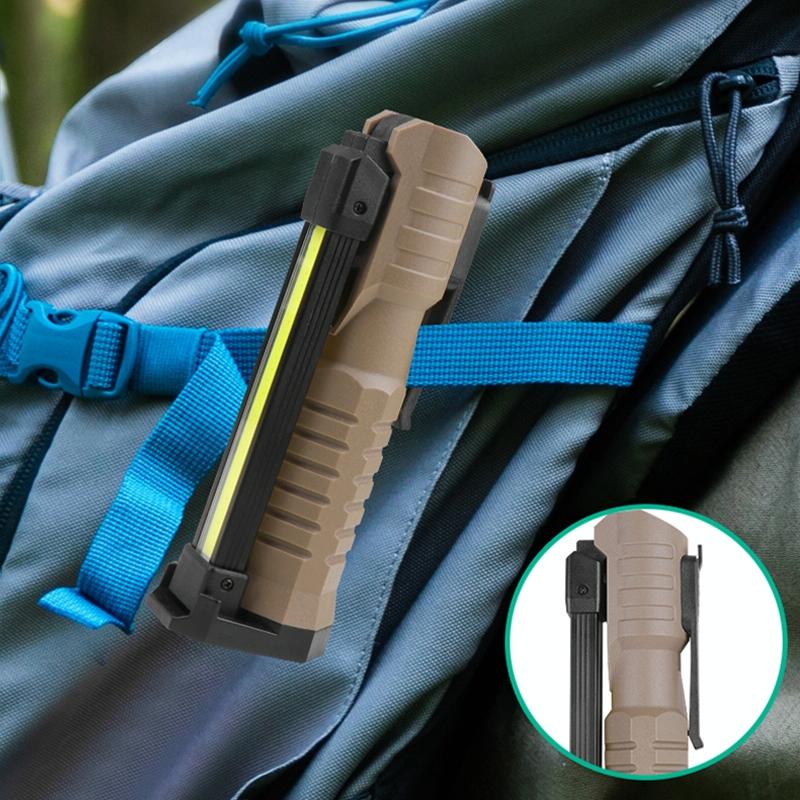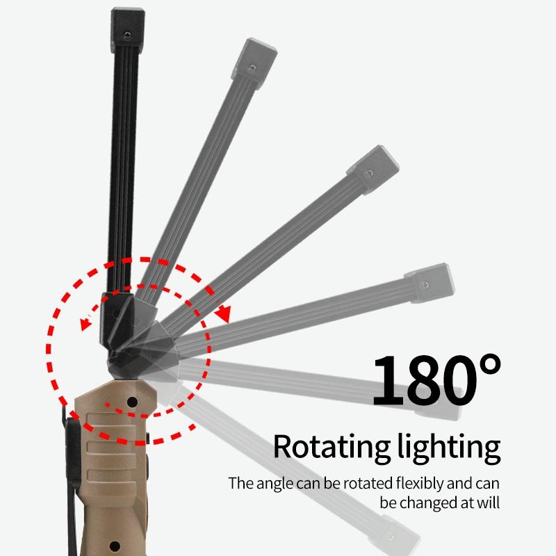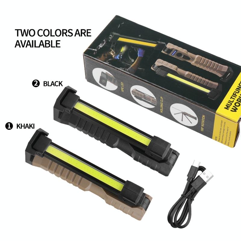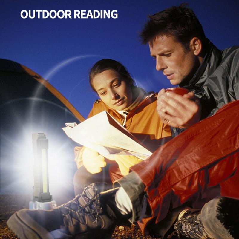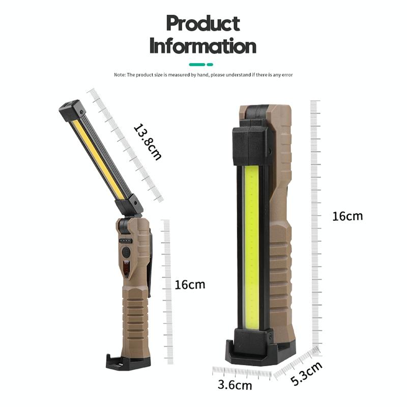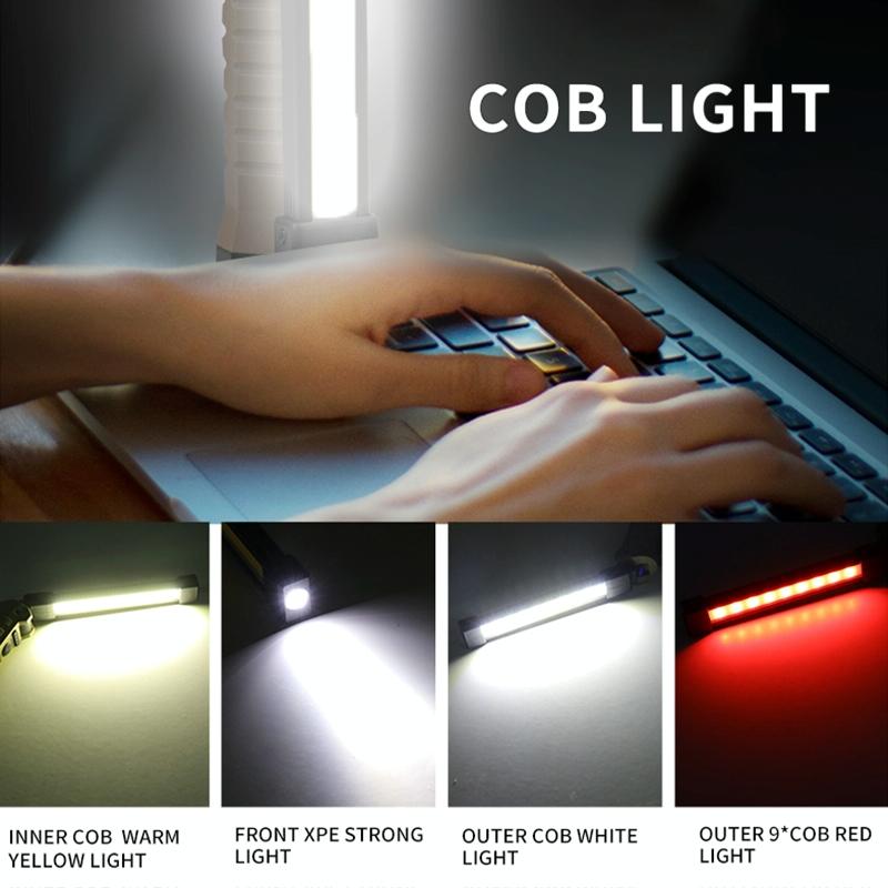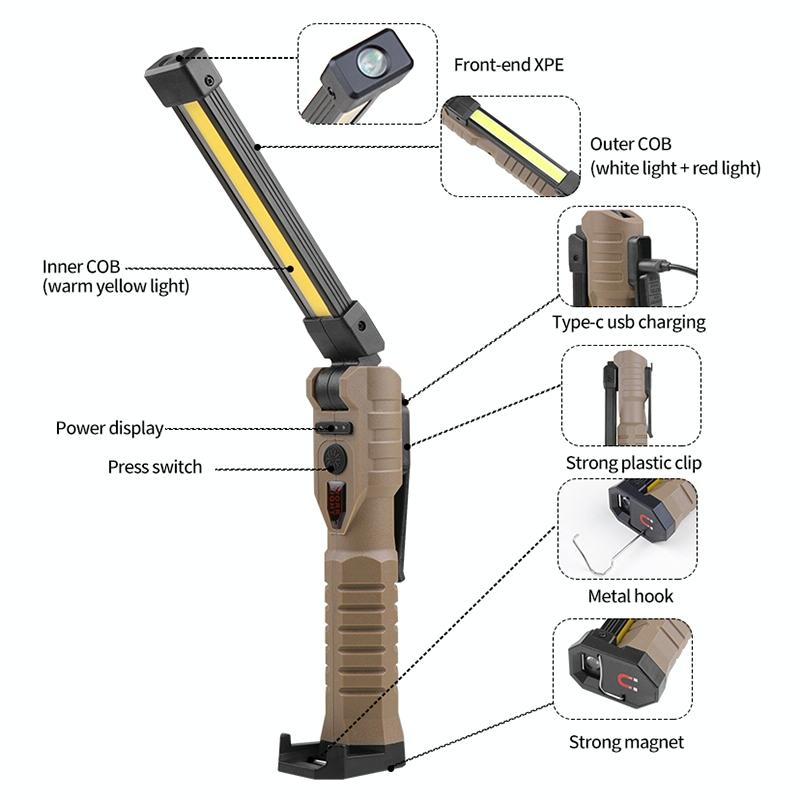 14. Features: Battery display, double-sided COB, 3 light source options, USB output can be used as a power bank, can be folded up and down 180 degrees, with magnets and hidden hooks, convenient for vertical and handheld use, yellow light penetration is better , red light warning