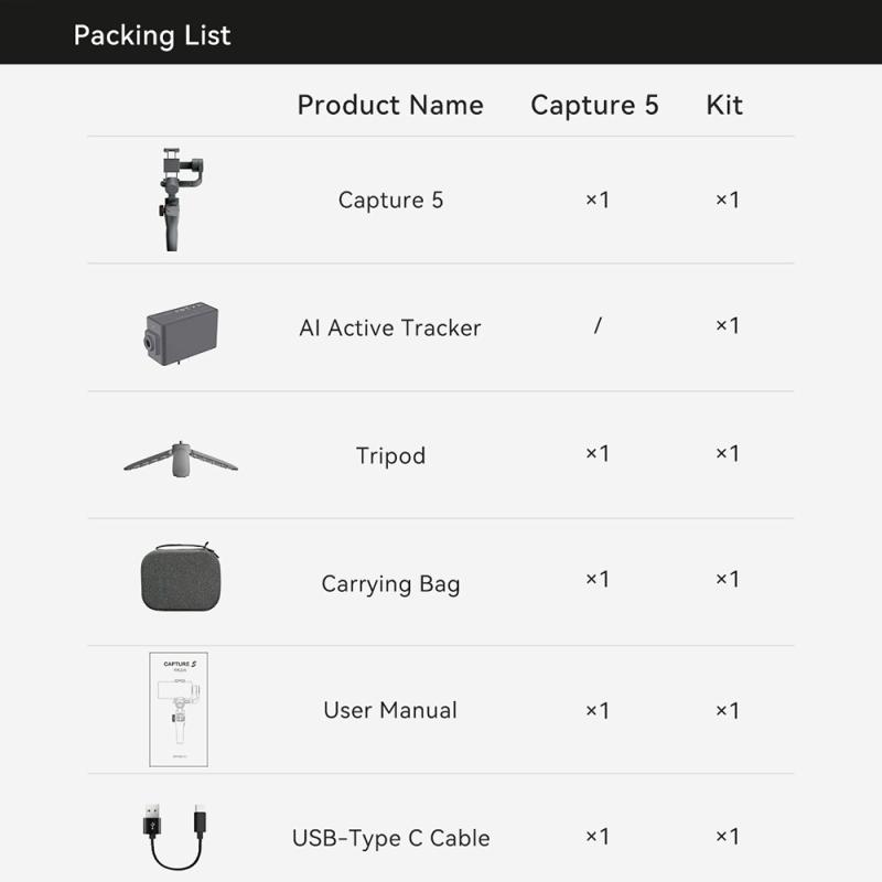 Combo visoin: Capture 5 gimbal x 1, tripod x 1, storage bag x 1, user manual x 1, tracking module x 1, data cable x 1