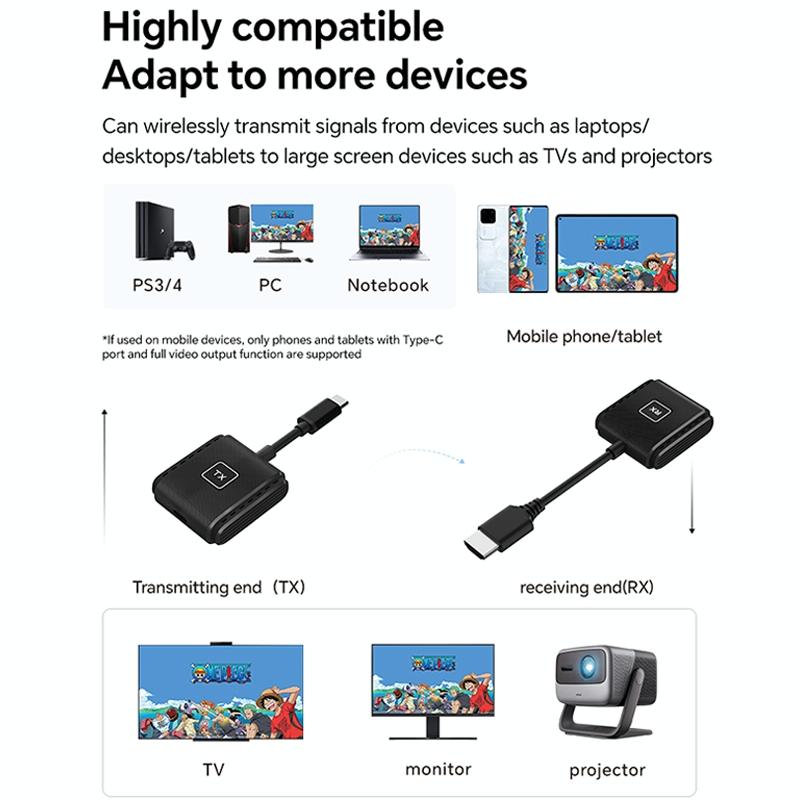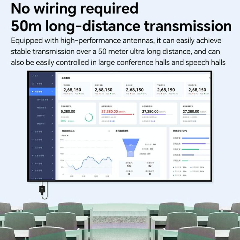 The USB-C wireless transmitter transmits high-definition audio and video signals via 5G WiFi. HD videos from PCs or mobile devices with full-featured functions are transmitted via WiFi, which can achieve one-to-one applications. The device has excellent image processing and transmission capabilities, making signal transmission smoother and more stable.