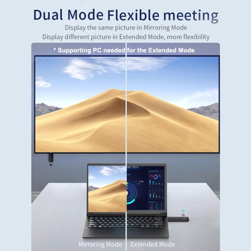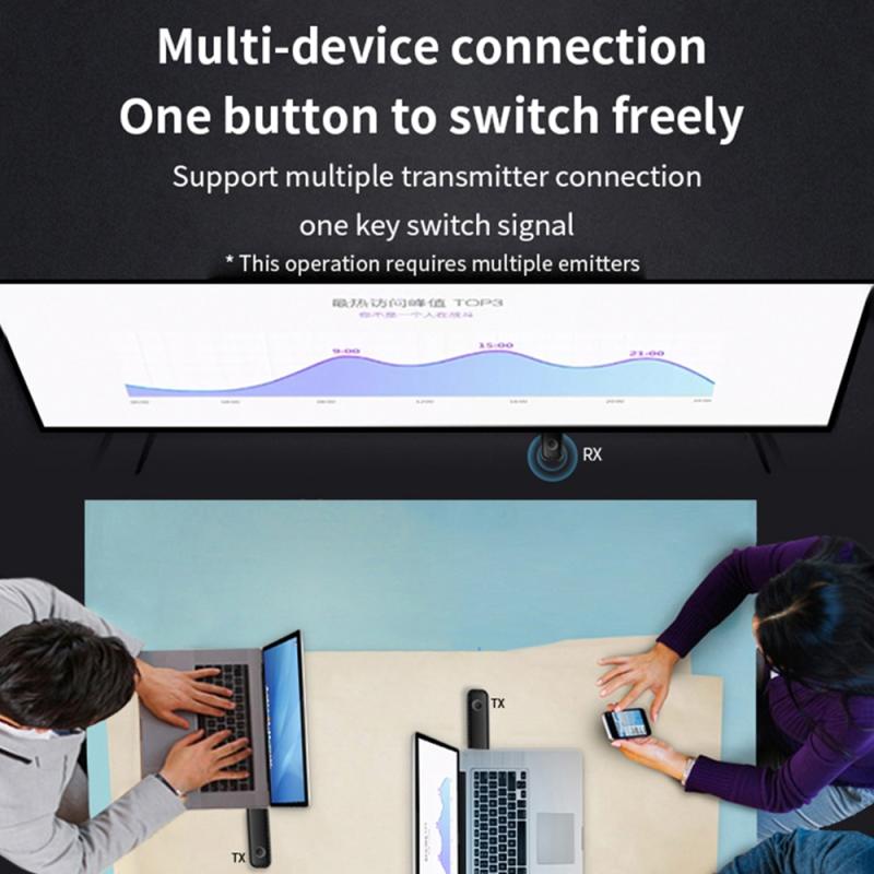 1. Support wireless HDMI screen projection: This smart wireless HDMI transmitter and receiver supports screen projection and screen expansion functions, which can wirelessly transmit HDMI signals from your computer, set-top box, game console, camera and other devices to large-screen devices such as TV and projector, and are widely used in daily office, meeting, entertainment, etc.