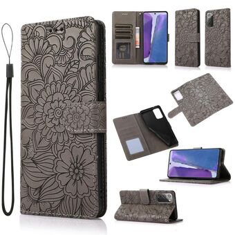 For Samsung Galaxy Note20 Flower Embossing Pattern Shockproof Protective Case with Holder & Card Slots & Photo Frame(Grey)