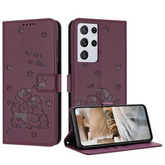 For Samsung Galaxy S21 Ultra 5G Embossed Kitten Phone Leather Case with Lanyard(Wine Red)