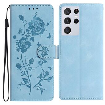 For Samsung Galaxy S21 Ultra 5G Rose Flower Embossing Pattern Leather Phone Case(Sky Blue)