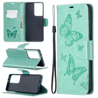 For Samsung Galaxy S21 Ultra 5G Embossing Two Butterflies Pattern Horizontal Flip PU Leather Case with Holder & Card Slot & Wallet & Lanyard(Green)