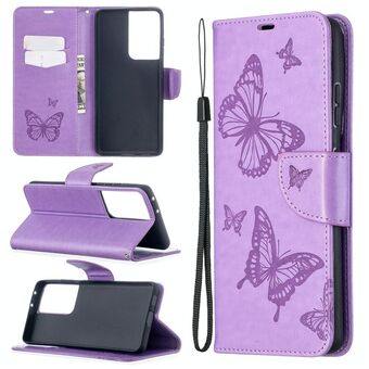 For Samsung Galaxy S21 Ultra 5G Embossing Two Butterflies Pattern Horizontal Flip PU Leather Case with Holder & Card Slot & Wallet & Lanyard(Purple)