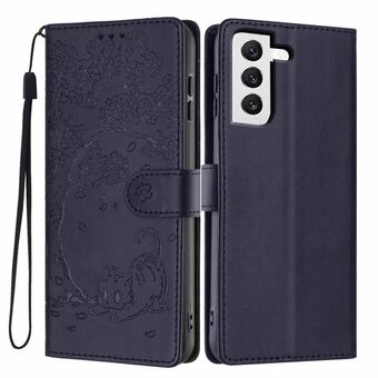 For Samsung Galaxy S22+ 5G Tree Cat Embossed Flip Vegan Leather Phone Case(Purple)