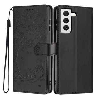 For Samsung Galaxy S22 5G Tree Cat Embossed Flip Vegan Leather Phone Case(Black)