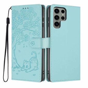For Samsung Galaxy S22 Ultra 5G Tree Cat Embossed Flip Vegan Leather Phone Case(Light Green)