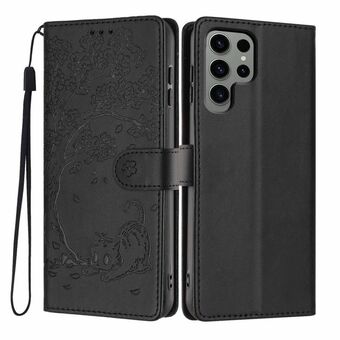 For Samsung Galaxy S22 Ultra 5G Tree Cat Embossed Flip Vegan Leather Phone Case(Black)