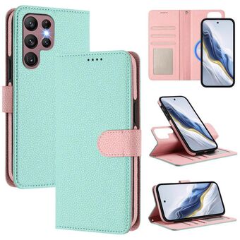 For Samsung Galaxy S22 Ultra 5G Detachable Litchi Texture Magnetic Side-Patch Vegan Leather Phone Case(Mint Green Pink)