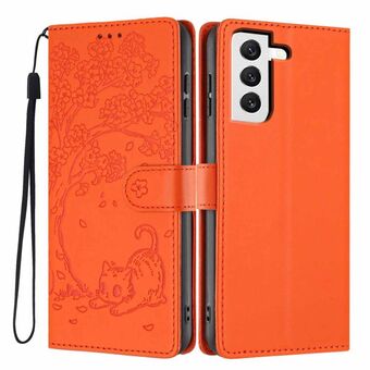 For Samsung Galaxy S22 5G Tree Cat Embossed Flip Vegan Leather Phone Case(Orange)