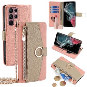 For Samsung Galaxy S22 Ultra 5G Splicing Zipper Wallet Vegan Leather Phone Case with Strap(Black)