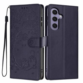 For Samsung Galaxy S24+ 5G Tree Cat Embossed Flip Vegan Leather Phone Case(Dark Blue)