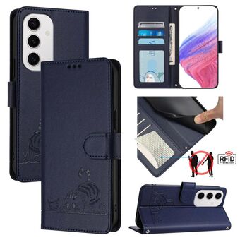 For Samsung Galaxy S24 FE 5G Cat Rat Embossed RFID Leather Phone Case with Lanyard(Blue)