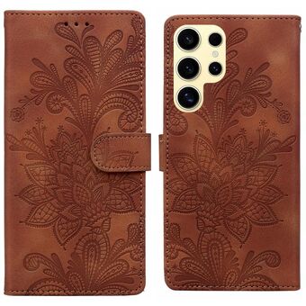 For Samsung Galaxy S24 Ultra 5G Lace Floral Embossed Magnetic Buckle PU Phone Case With Wrist Strap(Brown)