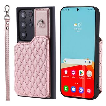 For Samsung Galaxy S23 Ultra 5G Grid Texture Card Bag Phone Case with Lanyard(Rose Gold)