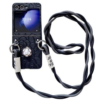 For Samsung Galaxy Z Fold5 5G Impression Camellia Pattern Protective Phone Case with Long Lanyard(Black)