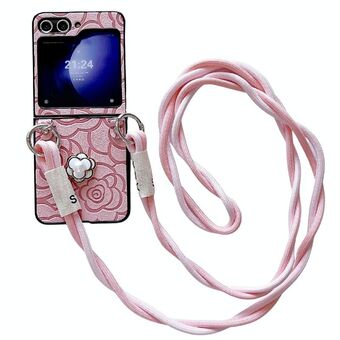 For Samsung Galaxy Z Fold5 5G Impression Camellia Pattern Protective Phone Case with Long Lanyard(Pink)