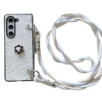 For Samsung Galaxy Z Fold5 5G Impression Camellia Pattern Protective Phone Case with Long Lanyard(White)