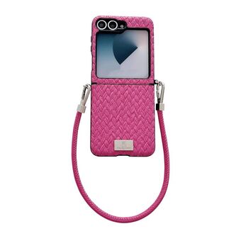 For Samsung Galaxy Z Flip6 5G / Flip7 FE Nameplate Style Straw Pattern Side Buckle Phone Case with Strap(Rose Red)