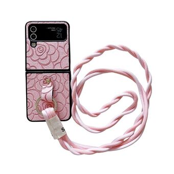 For Samsung Galaxy Z Flip4 5G Impression Camellia Pattern Protective Phone Case with Diamond Ring Long Lanyard(Pink)