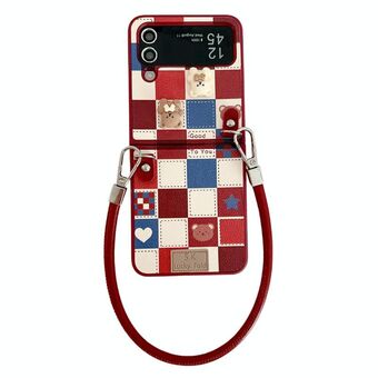 For Samsung Galaxy Z Flip4 Lattice Little Bear Pattern Full Coverage Phone Case with Wrist Strap(Red)