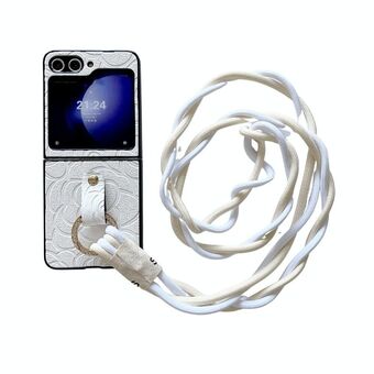 For Samsung Galaxy Z Flip5 5G Impression Camellia Pattern Protective Phone Case with Diamond Ring Long Lanyard(White)