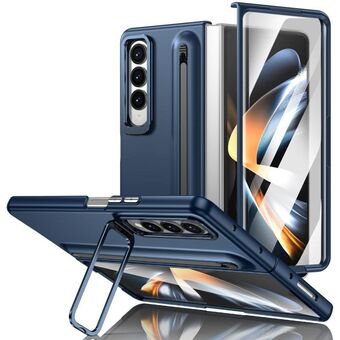 For Samsung Galaxy Z Fold4 5G Integrated Skin Feel Lens Folding Holder Pen Slot Shockproof Phone Case with Pen(Dark Blue)