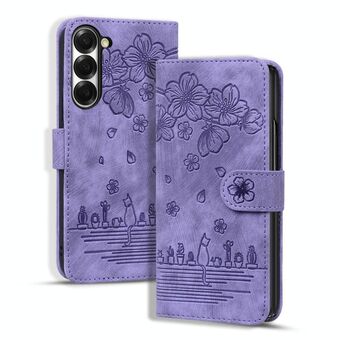 For Samsung Galaxy Z Fold6 Cartoon Sakura Cat Embossed Leather Phone Case(Purple)