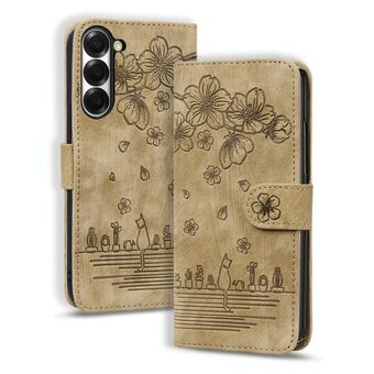 For Samsung Galaxy Z Fold6 Cartoon Sakura Cat Embossed Leather Phone Case(Brown)