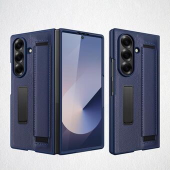 For Samsung Galaxy Z Fold7 5G Integrated Invisible Bracket Litchi Skin Pasting Phone Case with Hand Strap(Blue)