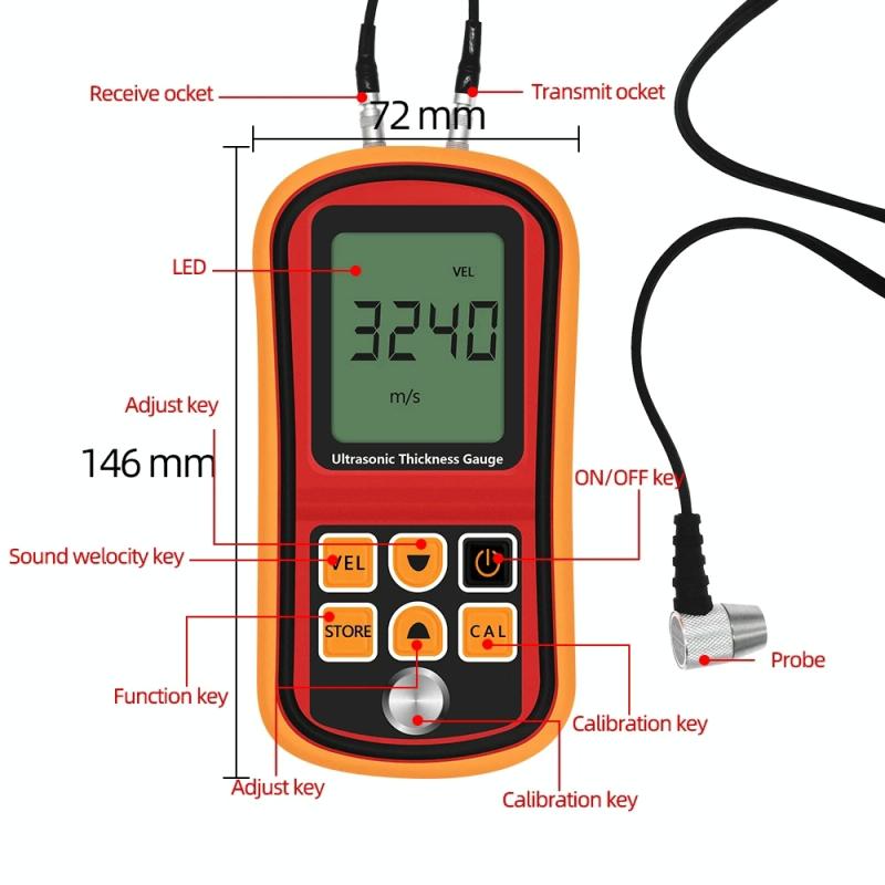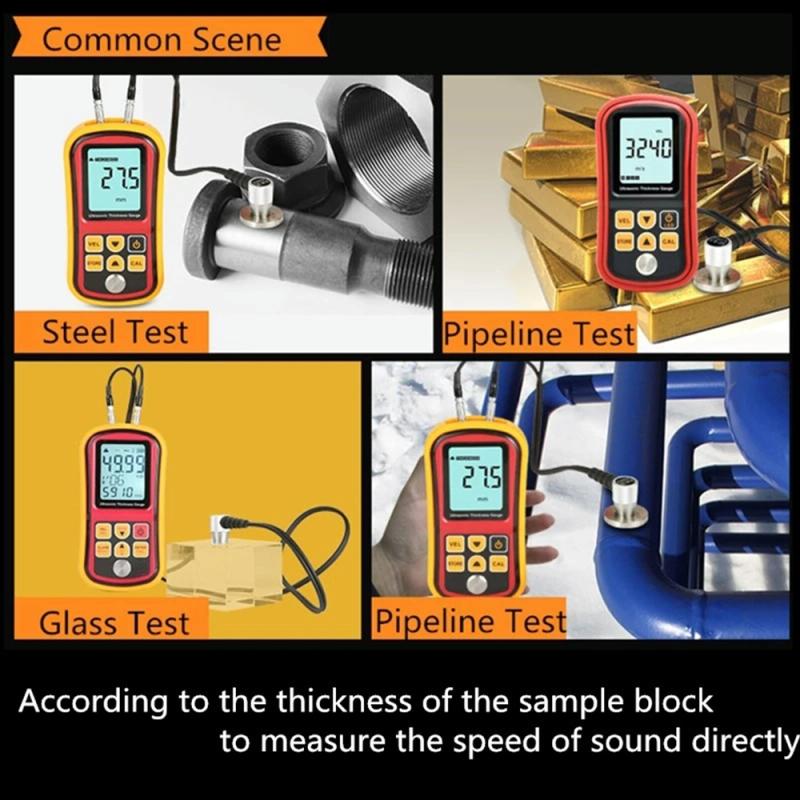 1. The tool has wide measurement range from 1.20 ~ 225.00 mm (0.047 ~ 8.86 inch) with accurate measurements. Moreover, the meter has ultrasonic wave velocity measurement function from 1000 m/s to 9999 m/s.