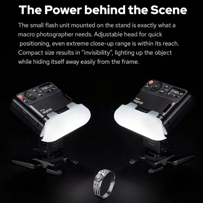 2. Compact Design: The MF12 Macro Flash is optimized for close-up photography due to its compact design and unique ability to be mounted directly to a lens via an optional adapter or placed around the subject with the included flash stand. Also, its size and wireless capabilities make it a good option for general photography as well.
