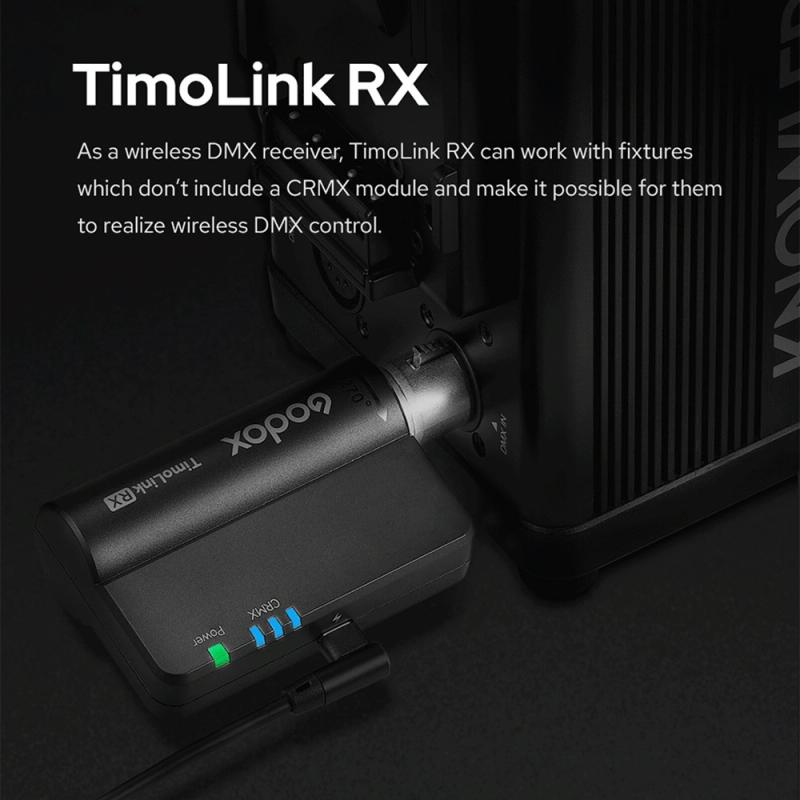 Built with CRMX modules from Lumenradio, TimoLink TX and TimoLink RX are wireless DMX transmitters and receivers compatible with Godox or other fixtures featuring DMX control capabilities. The transmitter TimoLink TX converts a wired DMX console to wireless by sending signals to CRMX-compatible fixtures (such as MG1200Bi and TP Series) or receivers. As for the receiver TimoLink RX, it works perfectly with DMX-compatible fixtures that do not include wireless modules (such as LD Series and some of UL Series, TL Series and KNOWLED M Series) and enables them to achieve wireless DMX control. TimoLink TX and TimoLink RX are ideal for filmmaking, broadcasting and other scenes where wireless DMX is needed.