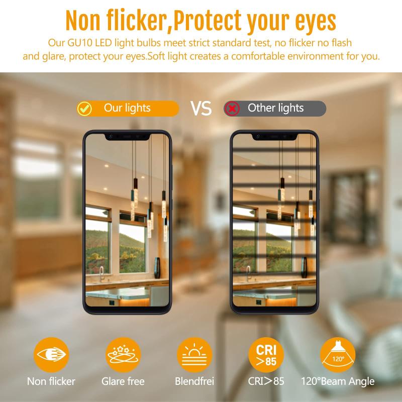 3. Easy to Install: GU10 base, these led bulbs fit well into any standard GU10 recessed lighting fixtures. Just plug and play. Mercury free and no UR/IR radiation, safe for family use.