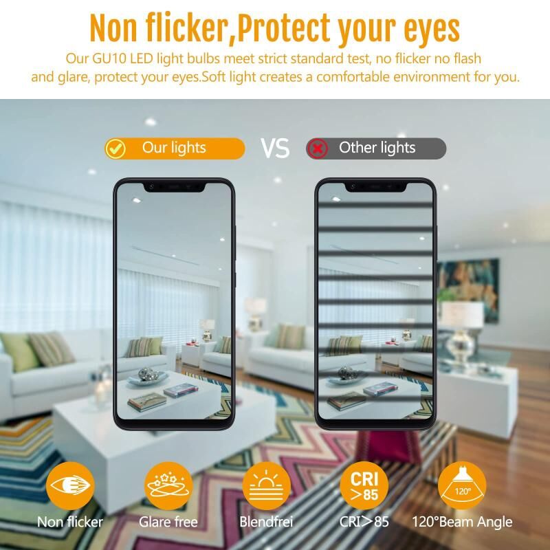 3. Easy to Install: GU10 base, these led bulbs fit well into any standard GU10 recessed lighting fixtures. Just plug and play. Mercury free and no UR/IR radiation, safe for family use.
