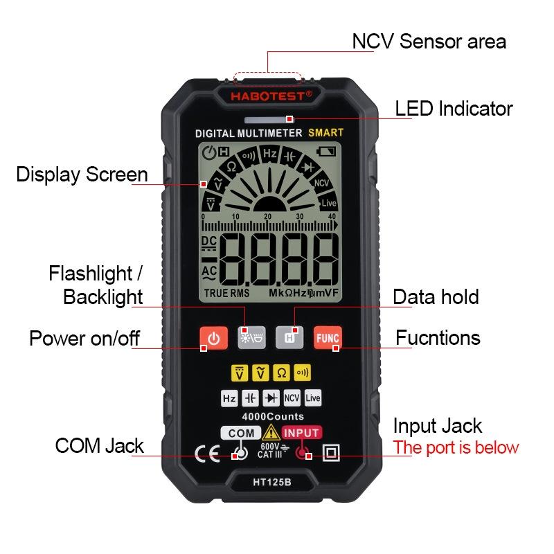 6. Measurement function: capacitance, battery, resistance, DC current, AC current, AC voltage, DC voltage