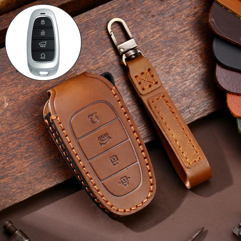 Hallmo Car Cowhide Leather Key Protective Cover Key Case for Hyundai 4-button Start(Brown) (Hallmo)