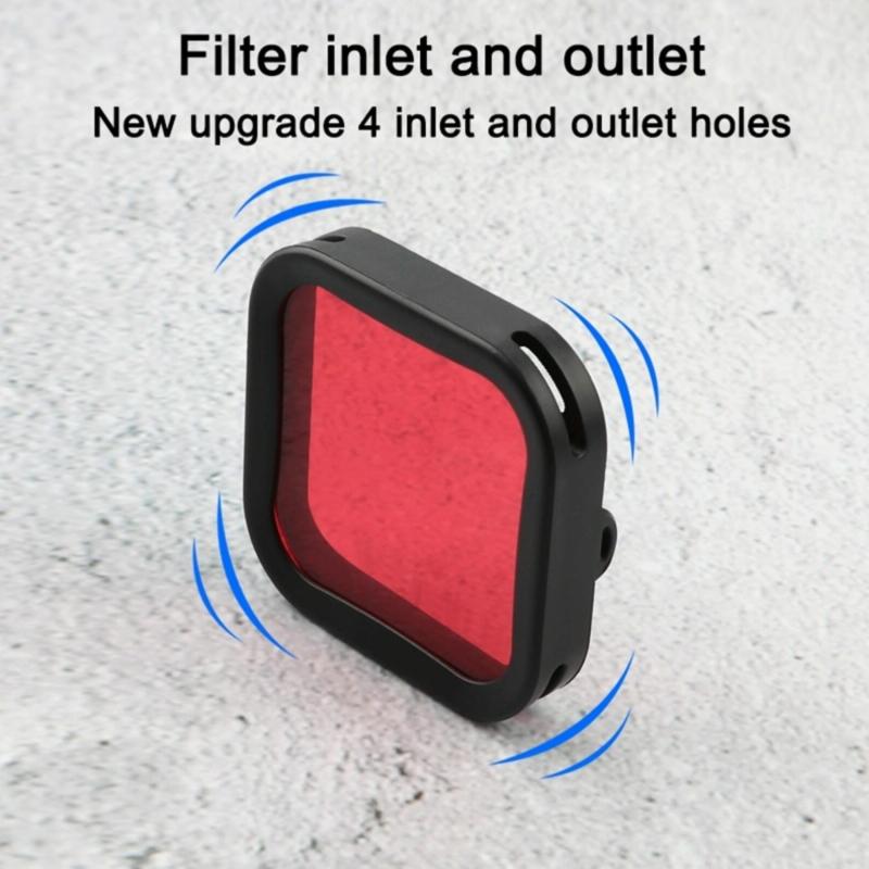 - Red filter: Red filter can be used around noon (sunlight direct water surface) in the water depth 10-20 meters, the main purpose is to reduce the red absorbed by water, effectively improve the blue phenomenon of underwater shooting, restore color balance, prevent shooting the image too blue or too green.